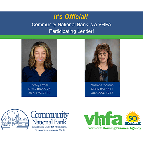 Vermont Housing Finance Agency offers programs to accommodate customers with modest and moderate-income levels, first-time homebuyers and customers needing assistance meeting down-payment requirements. VHFA programs offer competitive rates along with other added benefits. Community National Bank Assistant Vice President and Residential Lender Penny Johnson shared, “Partnering with VHFA opens many new opportunities for us to better serve our customers. We are looking forward to using their many programs to help our customers fulfill their dreams of homeownership.”